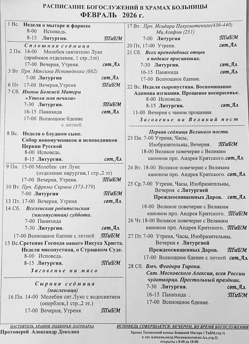 - В четверг в отделениях Больницы Святителя Алексия в 14.00 совершается молебен с водосвятием свт. Луке, архиепископу Крымскому, перед ковчежцем с его мощами (см. расписание).