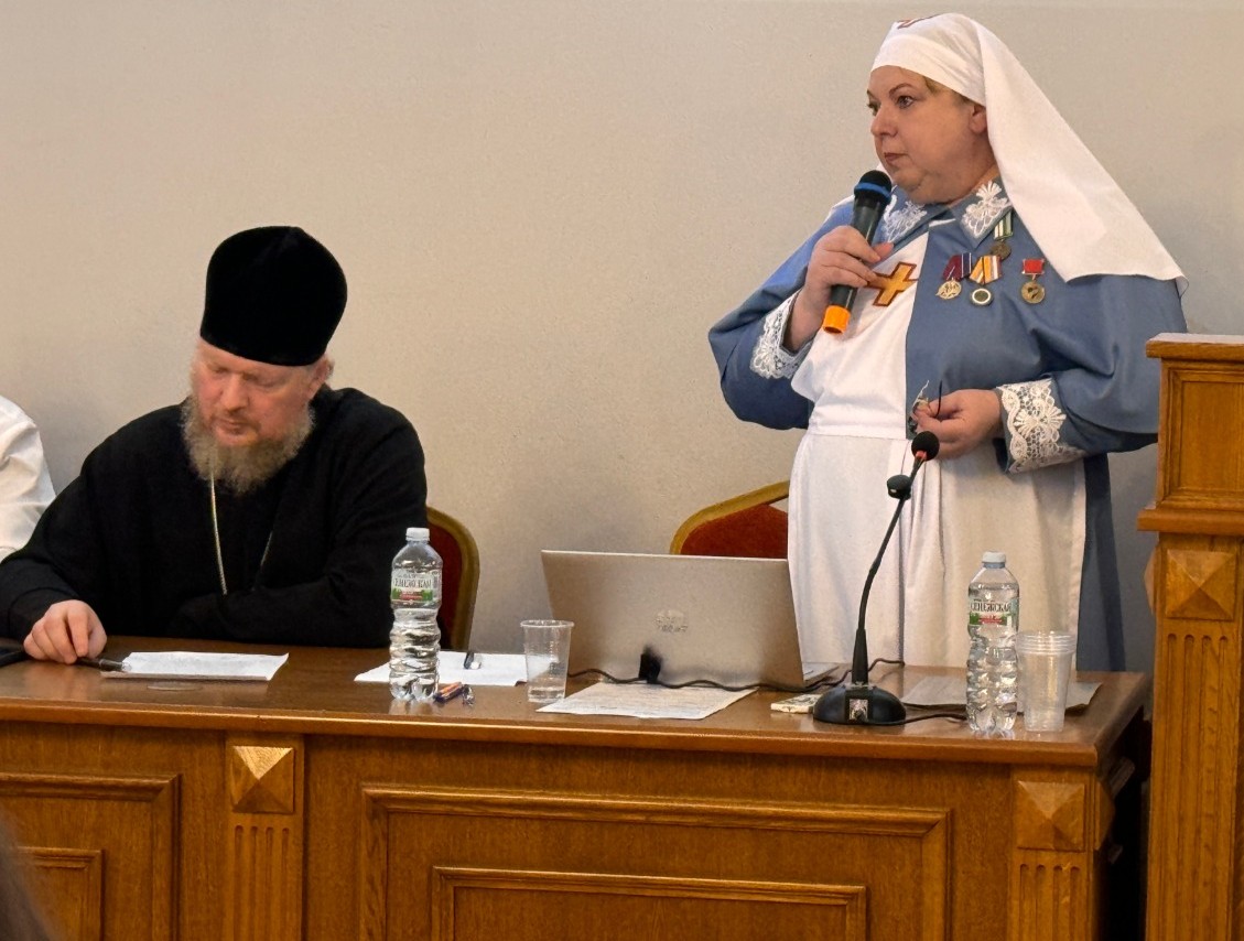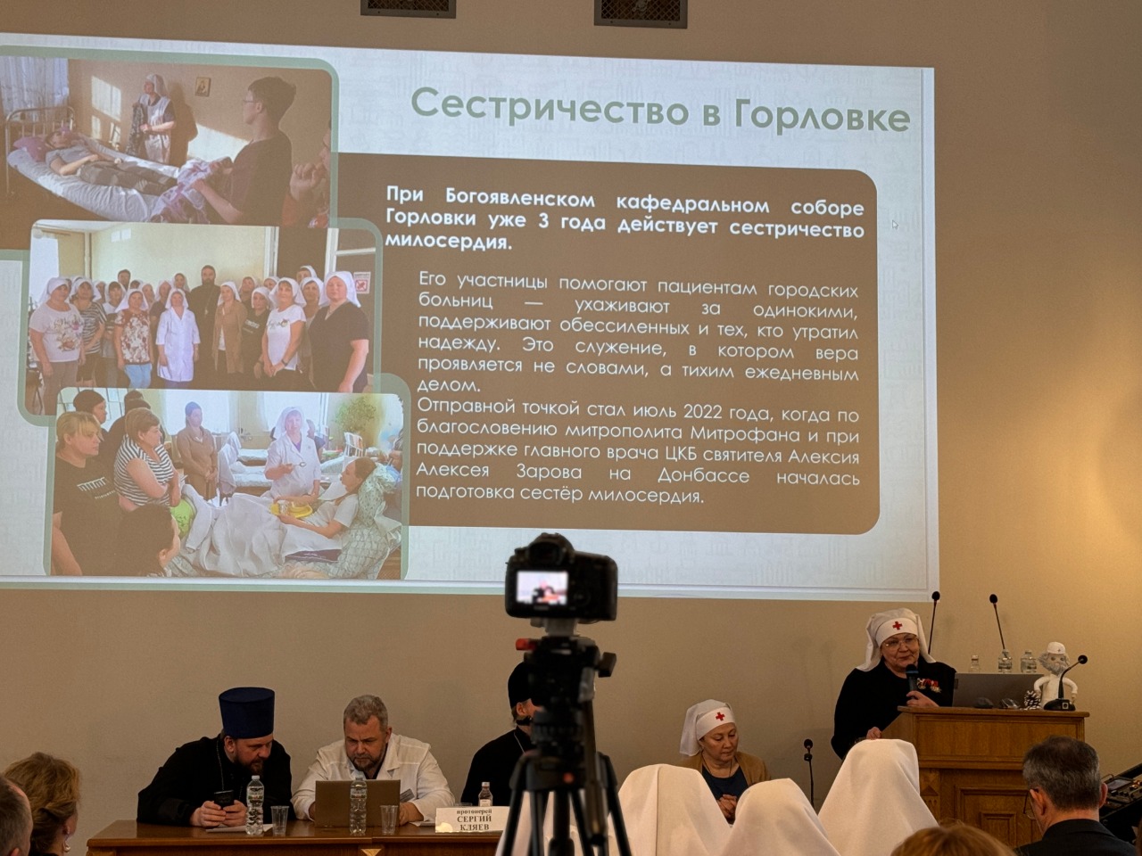 Опытом служения в прифронтовом городе поделилась сестра милосердия Горловского сестричества имени святого мученика Евгения врача Лариса Кривоног. Сëстры ухаживают за ранеными и тяжелобольными пациентами в местных больницах, оказывают патронажную помощь одиноким людям на дому. Горловское сестричество, организованное в июле 2022 года, стало первым созданным на Донбассе сестричеством.