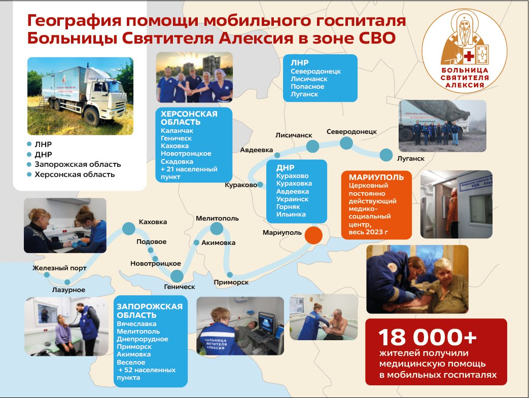 - Первый передвижной медицинский комплекс приступил к работе в начале января 2023 года в г. Мариуполе и постоянно действовал там до зимы 2024 года. На базе этого мобильного госпиталя в январе 2023 года Больница Святителя Алексия совместно с Синодальным отделом по благотворительности открыла церковный медико-социальный центр. Врачами Больницы Святителя Алексия проводился амбулаторный прием населения, в том числе с выездом к лежачим и маломобильным пациентам на дом, осуществлялась лабораторная и ультразвуковая диагностика, снятие ЭКГ. Прием вели посменно врачи терапевтических и хирургических специальностей. Врачи приняли 5120 пациентов.